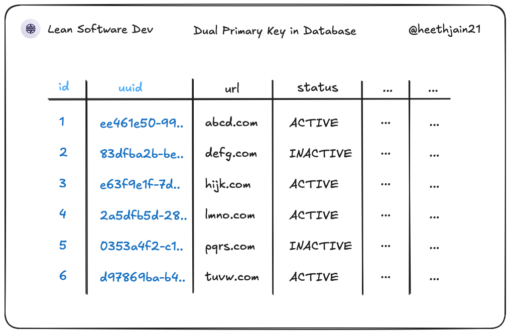 id) for internal tables, joins, and clustered index efficiency. - Added uuid public keys (